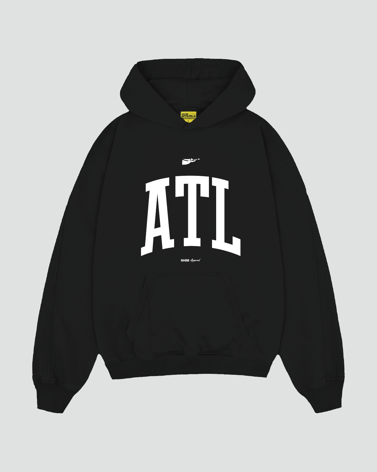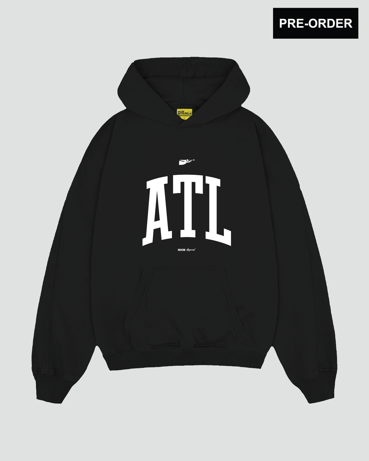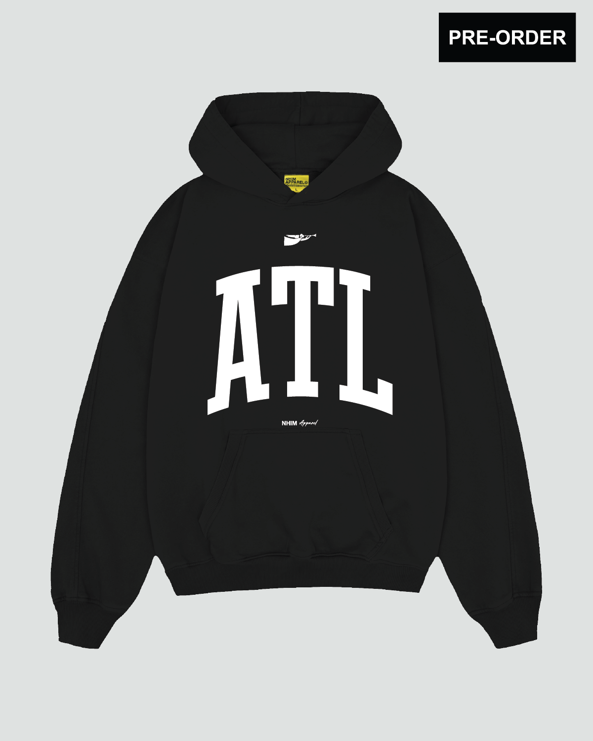 The God is in Atlanta Hoodie features a relaxed fit with drop shoulder. The front displays the Atlanta city acronym "ATL" along with the NHIM Angel icon and branding. The back features the "God is in Atlanta" logo along with NHIM branding.