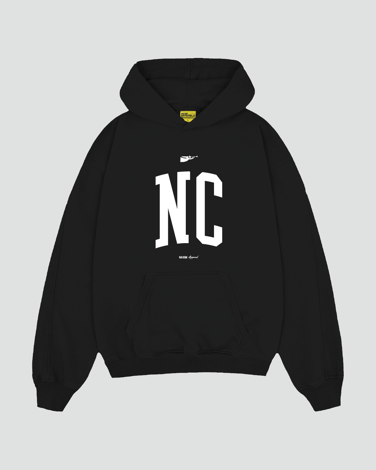 The God is in Carolina Hoodie features a relaxed fit with drop shoulder. The front displays the Carolina city acronym "NC" along with the NHIM Angel icon and branding. The back features the "God is in Carolina" logo along with NHIM branding.