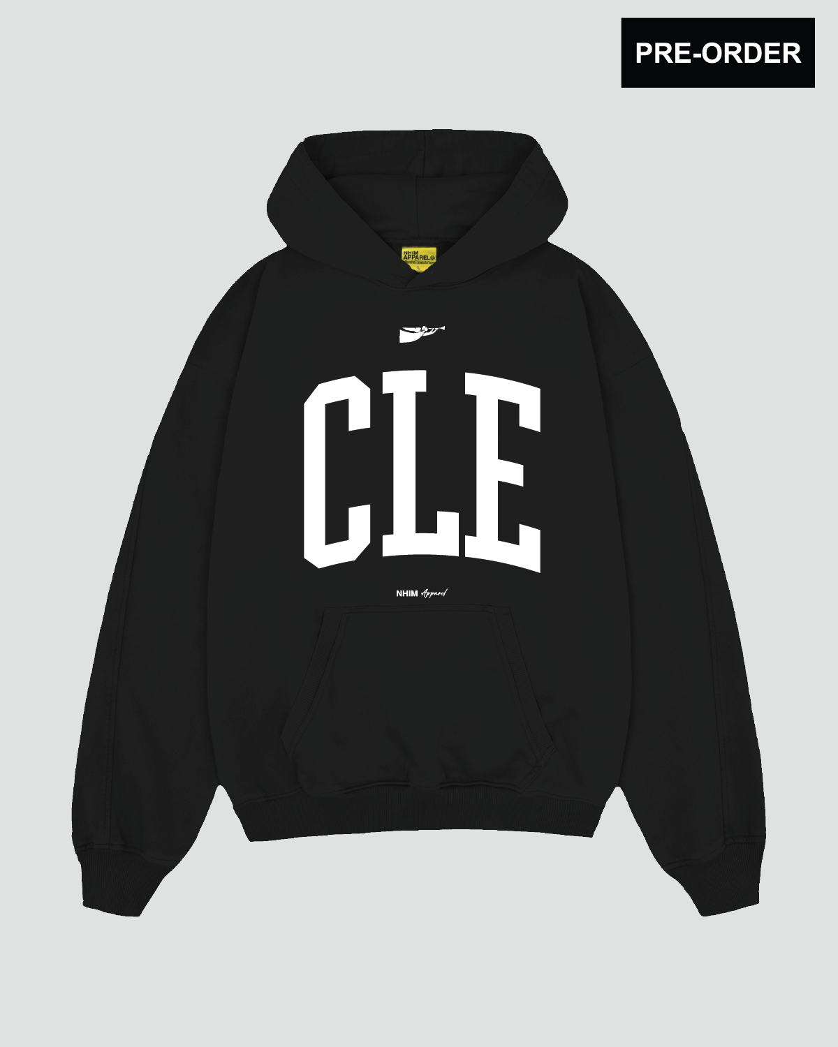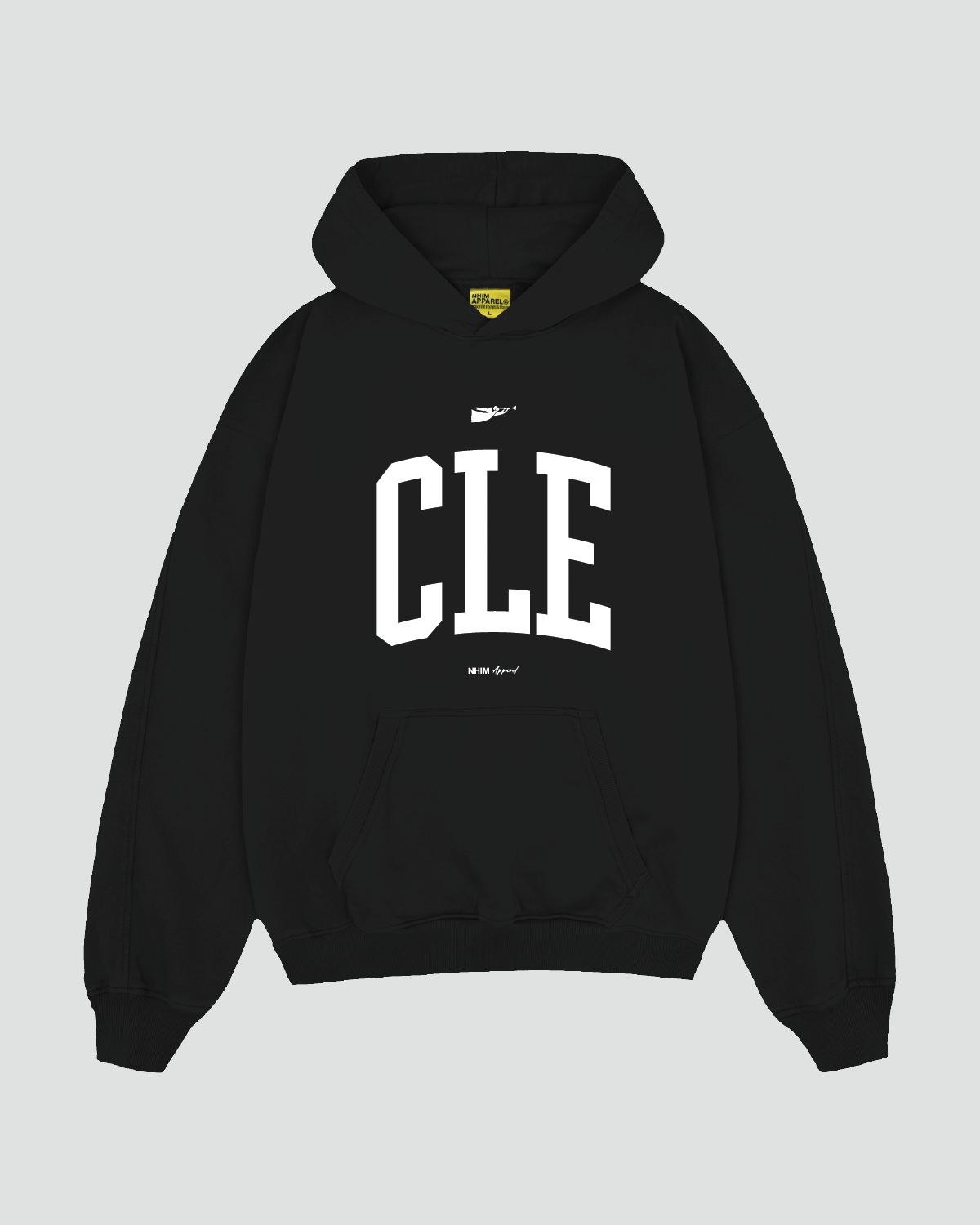 The God is in Cleveland Hoodie features a relaxed fit with drop shoulder. The front displays the Cleveland city acronym "CLE" along with the NHIM Angel icon and branding. The back features the "God is in Cleveland" logo along with NHIM branding.