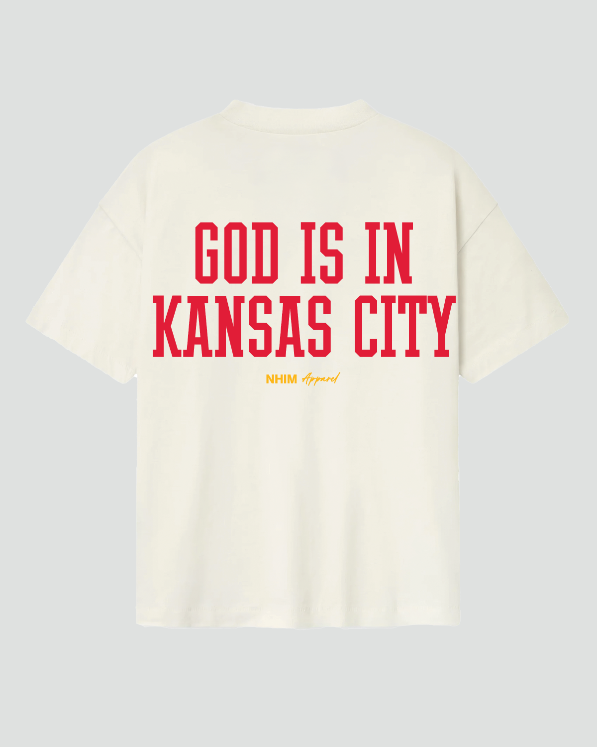 The God is in Kansas City Tee is made from 100% USA cotton jersey and features a relaxed fit with drop shoulder and a high-ribbed crewneck collar. The front displays the Kansas City city acronym "KC" along with the NHIM Angel icon and branding. The back features the "God is in Kansas City" logo along with NHIM branding. Colors printed in the iconic NFL Kansas City Chiefs color-ways.