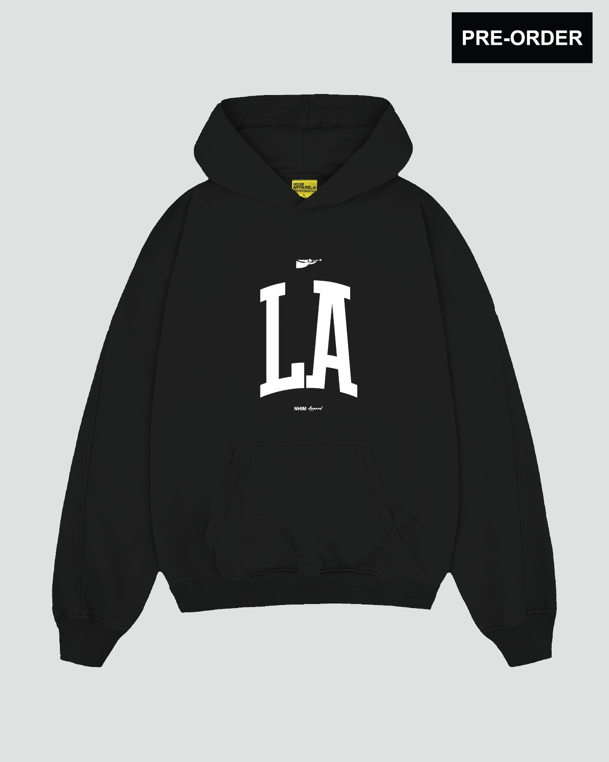 The God is in Los Angeles Hoodie features a relaxed fit with drop shoulder. The front displays the Los Angeles city acronym "LA" along with the NHIM Angel icon and branding. The back features the "God is in Los Angeles" logo along with NHIM branding.