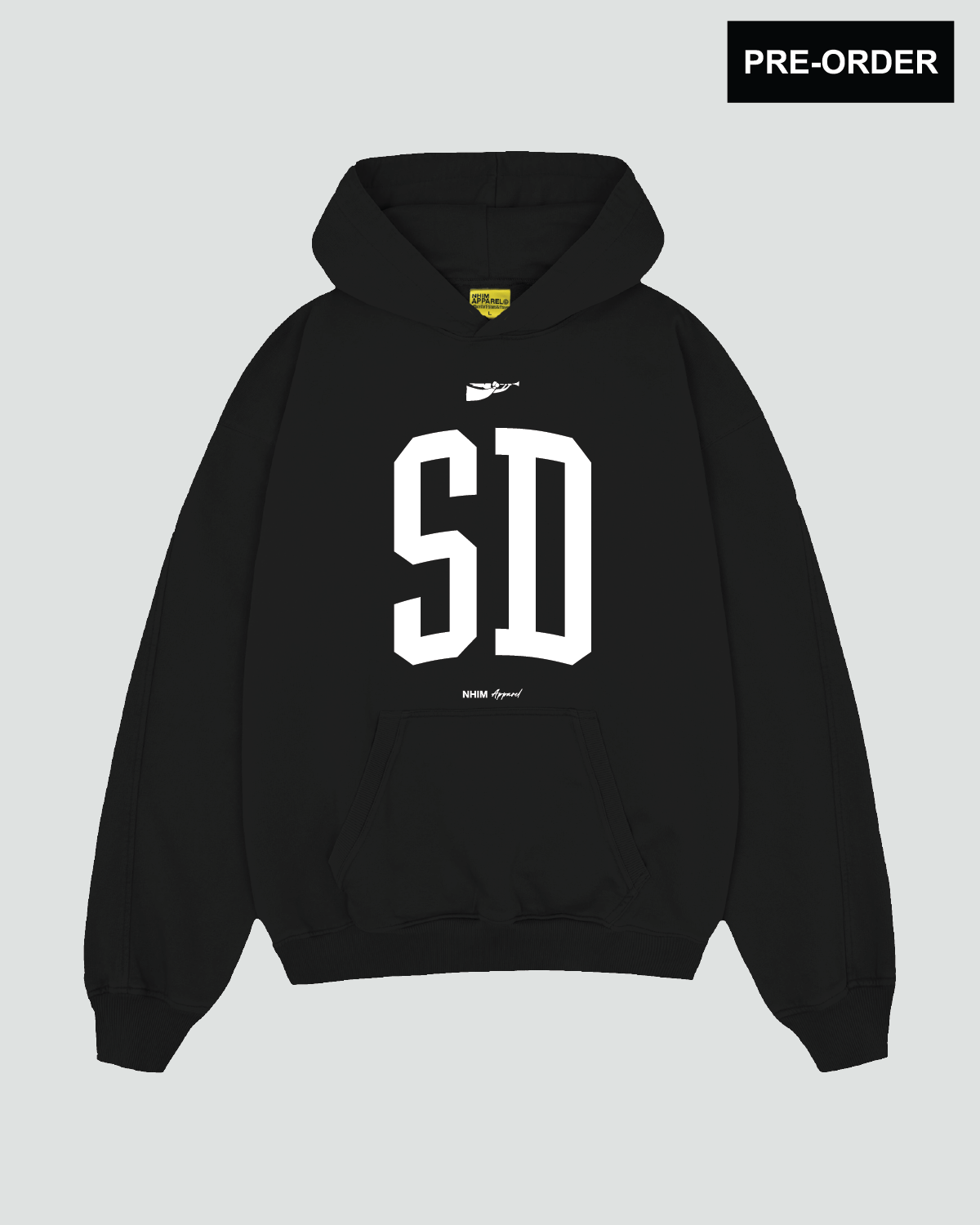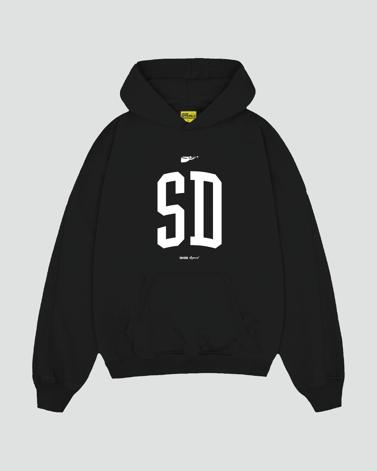 The God is in San Diego Hoodie features a relaxed fit with drop shoulder. The front displays the San Diego city acronym "SD" along with the NHIM Angel icon and branding. The back features the "God is in San Diego" logo along with NHIM branding.