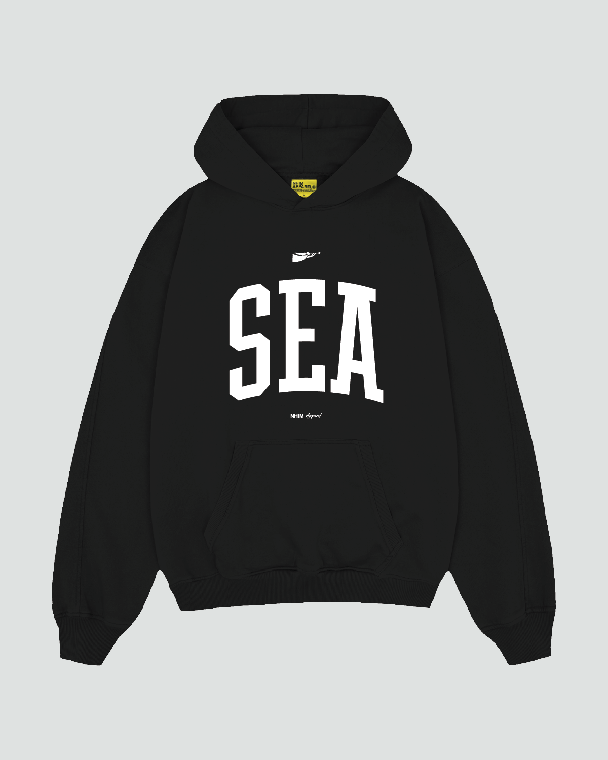The God is in Seattle Hoodie features a relaxed fit with drop shoulder. The front displays the Seattle city acronym "SEA" along with the NHIM Angel icon and branding. The back features the "God is in Seattle" logo along with NHIM branding.