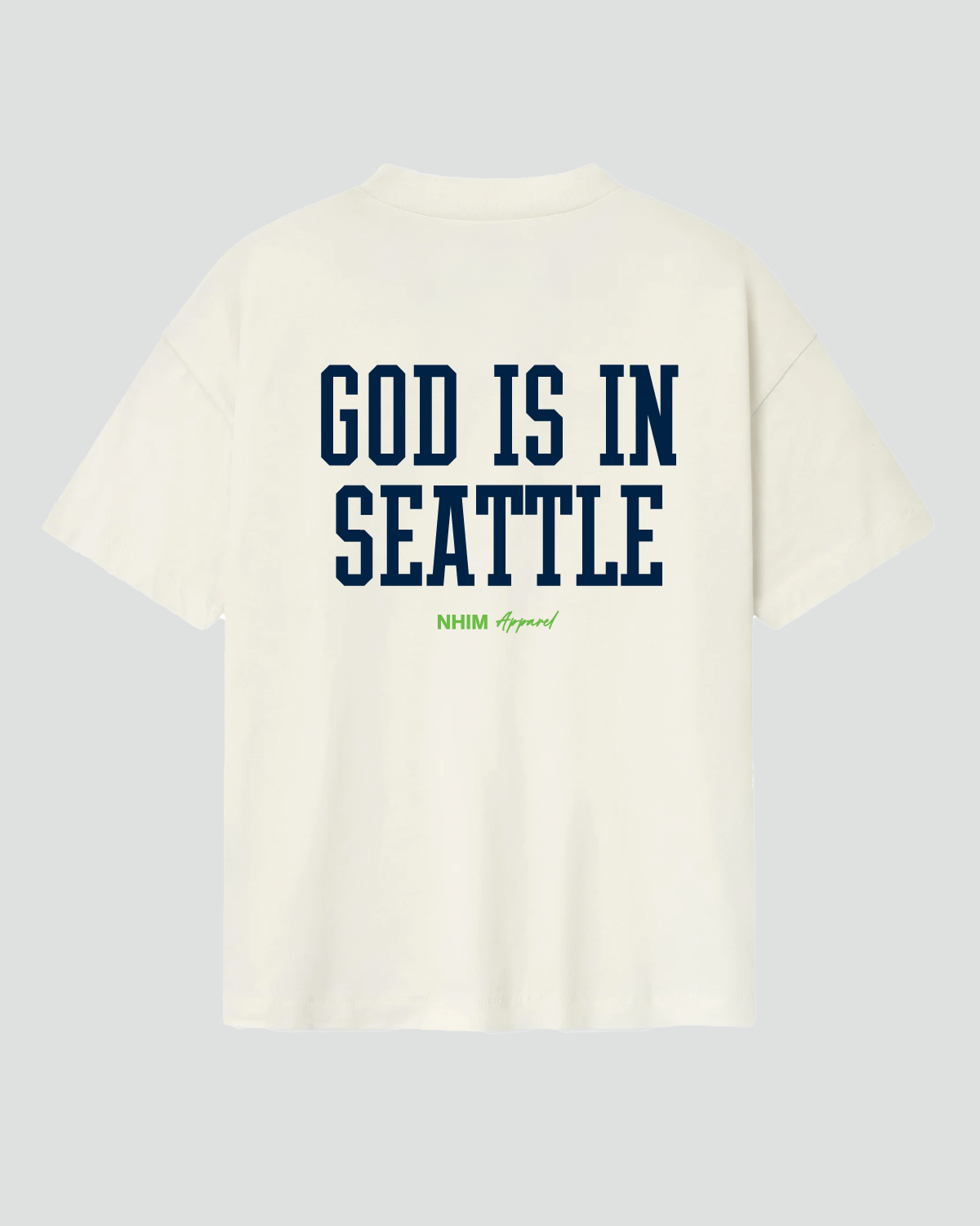 The God is in Seattle Tee is made from 100% USA cotton jersey and features a relaxed fit with drop shoulder and a high-ribbed crewneck collar. The front displays the Seattle city acronym "SEA" along with the NHIM Angel icon and branding. The back features the "God is in Seattle" logo along with NHIM branding. Colors printed in the iconic NFL Seattle Seahawks color-ways.