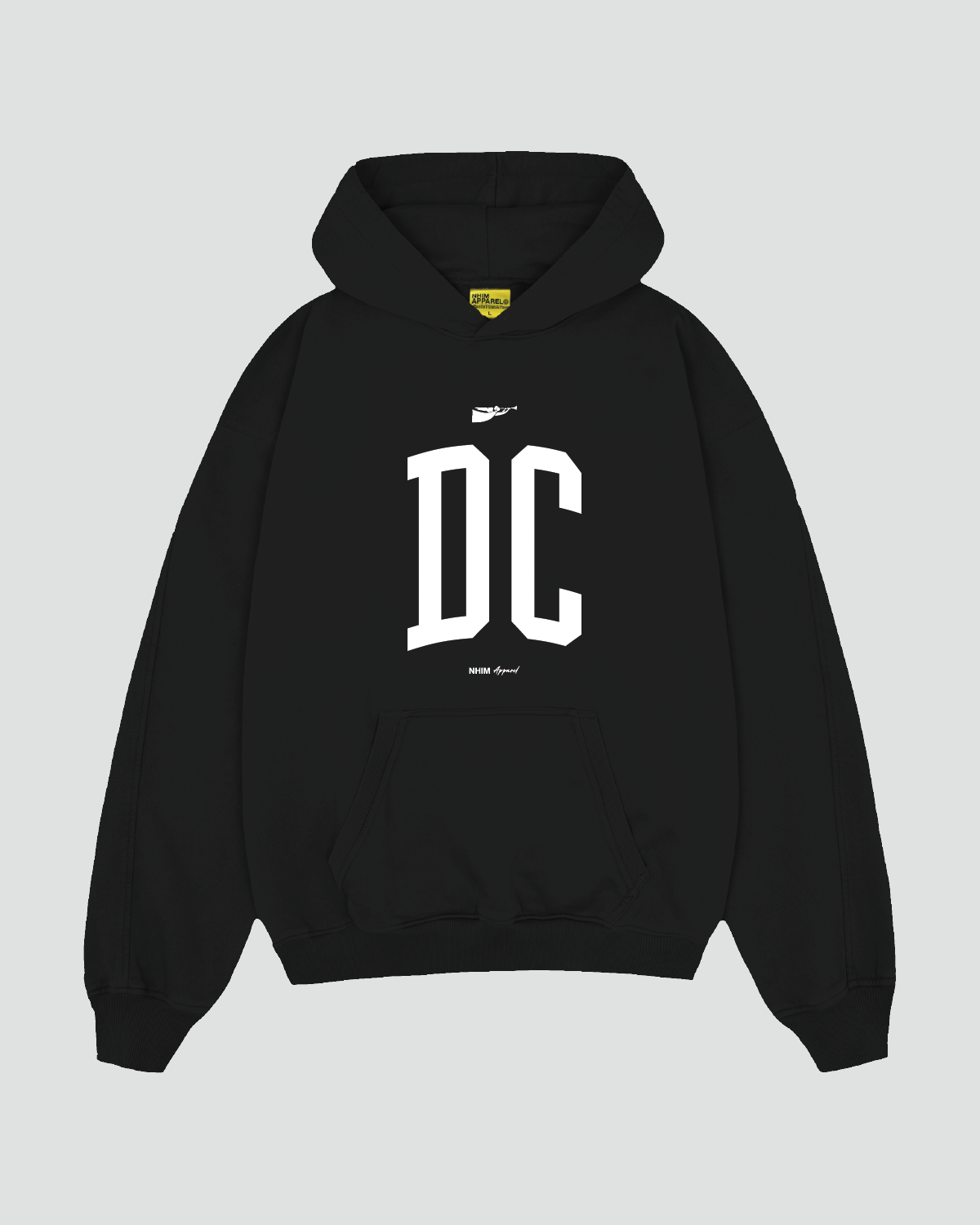 The God is in Washington Hoodie features a relaxed fit with drop shoulder. The front displays the Washington city acronym "DC" along with the NHIM Angel icon and branding. The back features the "God is in Washington" logo along with NHIM branding.